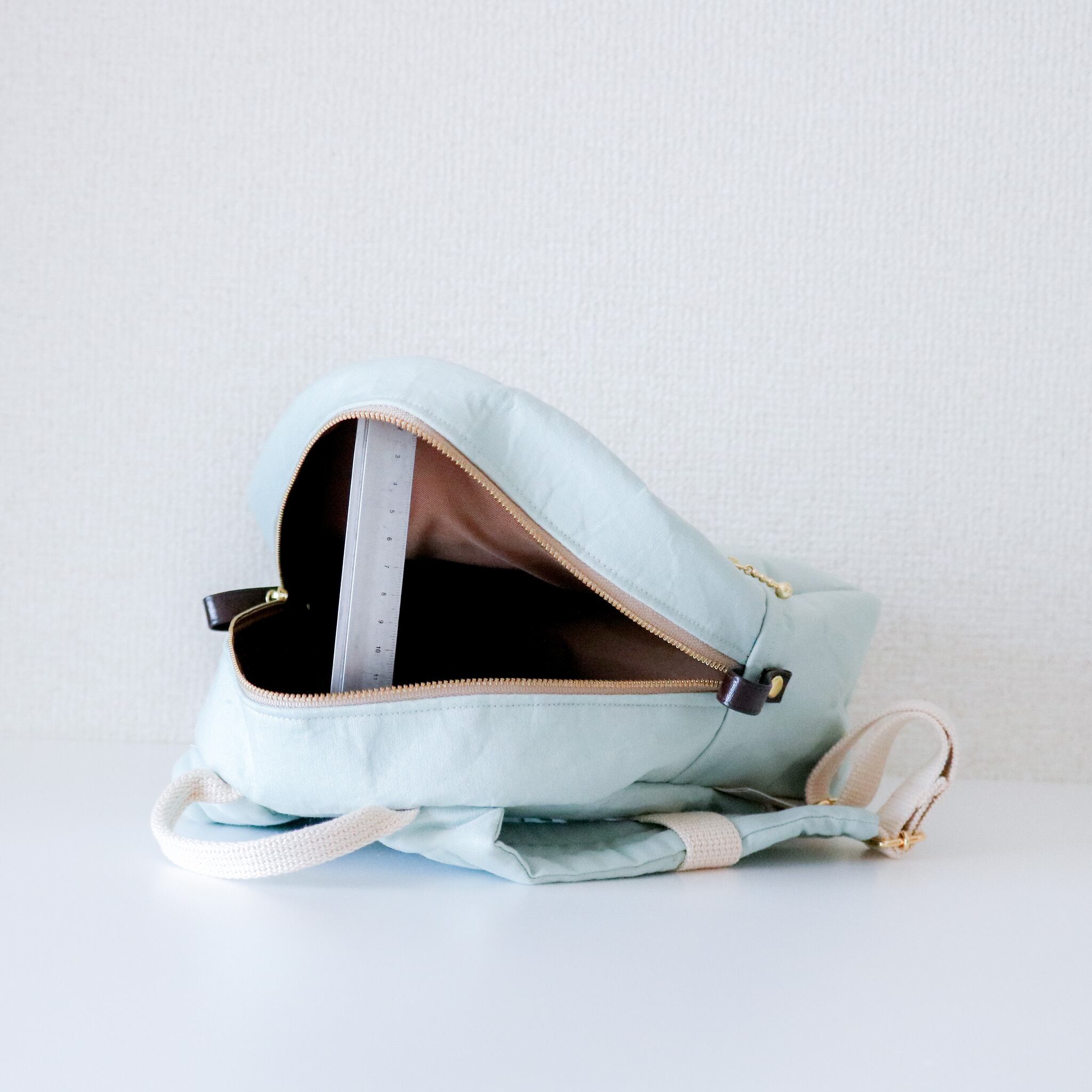 ハード芯を貼り付け、自立するしっかりしたつくりに。アクティブに動いてお茶などが多少こぼれても安心なよう、内側の生地はブラウンの防水ナイロンを採用しています。縫い目を同色のバイアステープで縁取り、縫い目が見えないよう工夫しました。